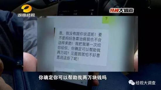 原标题:警方行动 揭开“美女大学生”卖身救母陷阱 最近,长沙市民吴先生接到一条求助短信,对方声称自己名叫琪琪,是长沙某校的女大学生,她的母亲身患重病无钱医治,希望能够得到“好心人”的救助,并愿意出卖自己的人生“第一次”作为回报。接到短信的吴先生格外惊讶,一个女学生如果不是走投无路,怎么会想通过出卖“初夜”来换取救助呢?好心的吴先生赶紧联系经视大调查记者,想要帮帮这个女孩。 热心市民想伸出援手 女大学生主动“卖身”约见面 这就是琪琪往市民吴先生手机上发来的短信。琪琪自称是长沙某校的大一学生,今年18岁,因为家中有急事,想向吴先生寻求帮助。 出卖初夜寻求帮助!这样的求助让吴先生十分震惊,为了了解更多情况,好心的吴先生加了琪琪的微信。 从照片上看,琪琪长得十分清秀漂亮,作为一名大一学生,她原本不应该用出卖“初夜”的方式来寻求帮助。她到底是遇到了什么困难? 琪琪表示,自己的妈妈患重病,花光了家里的所有积蓄,目前急需要两万块钱来治病,不得已自己才想出了这个方法来筹钱。 通过几天的接触,琪琪主动要求与吴先生见面,见面地点就是琪琪所在的某学校的门口。 热心市民想伸出援手 女大学生主动“卖身”约见面 如果不是真的走投无路,女孩怎么会想出这种办法来求助呢?好心的吴先生越想越觉得可怜,为了真正帮助到琪琪,同时不引起不必要的误会和麻烦,吴先生找到了记者,想和记者一起去和琪琪见面。中午12点,一名身穿黑色棉袄的女子出现在某学校的门口,与照片中的琪琪十分相似。 谁知,吴先生上前打招呼,对方却并不理会,快速穿过马路到了学校对面。 琪琪飞快地带着吴先生来到了附近一家餐厅,这才开口与吴先生交流起来。 琪琪介绍,自己是河南人,今年18岁,是这所学校的大一学生,家里除了得乳腺癌的妈妈之外,还有一个弟弟需要抚养。 面对吴先生的关心,琪琪显得很不耐烦,不愿多说,竟主动开口要求吴先生去开房。 吴先生立即表示自己可以无偿帮助,不需要琪琪出卖“初夜”来偿还,谁知琪琪并没有对此感恩,反而立马变了脸。 吴先生万万没想到,自己的一片好心却换来琪琪如此反应,琪琪带上帽子,快速离开了现场。 记者追踪调查 “女生”竟被豪车接走? 按照琪琪所说,她的母亲重病急需2万元钱救助,但她却拒绝了吴先生提出的向社会众筹的方式,也不愿意接受他不要回报的帮助。这让人感觉格外疑惑,那么,琪琪为什么不愿意通过正常渠道求助?下午三点,琪琪和吴先生分开之后,记者偷偷跟上,只见琪琪在这所学校的门口站了一会之后,转身朝学校里面走去。 不过,她并没有直接回宿舍,也没去教学楼,而是独自来到了学校操场。 下午四点左右,琪琪起身准备从操场离开,来到了学校旁边的小吃街吃东西。 四点半,琪琪接了一个电话,起身离开。可奇怪的是,她仍然没有去教学楼和宿舍,而是快步走出了校门。 原本应该是学生下课回宿舍的时间,琪琪却上了一台豪车离开了学校,这与她描述的家庭困难需要帮助的形象也严重不符。她究竟是不是学校的学生? 在这所学校的副书记办公室,工作人员只看了一眼琪琪提供的校园卡照片,就认定这张校园卡是假的!同时,工作人员也在院学院数据库对琪琪的身份展开核查,结果令人吃惊! 学校的学生学籍数据库里根本没有与琪琪身份相符的学生信息,也就是说琪琪自称是大学生的身份是假的! 警方出现核查身份 “女学生”紧张抗拒 调查到这里,琪琪的故事竟来了个180°大逆转,“琪琪”竟然压根不是这所高校的“大学生”!她出示的该学校的校园卡照片也被学校认定是假冒的!那么,她所说的母亲患绝症的悲惨故事又是不是真的呢?这一切急需找到琪琪本人求证,而就在此时,琪琪又主动联系上了吴先生。 19号上午,琪琪再次给吴先生发来微信求助,并约吴先生中午11:30在远大二路附近一酒店碰面。 一见面,琪琪还是坚持以出卖“初夜”的方式来换取两万块钱现金。 不过,琪琪却声称,只要出得起钱,自己可以长期提供服务。 与此同时,为了查明这个“女大学生”琪琪的真实身份,当地派出所民警也悄然赶到了现场,准备现场核实琪琪的身份。面对民警的突然造访,琪琪突然变得紧张起来。 面对大家,琪琪非常紧张,不断拒绝配合警方的调查。 在派出所,琪琪的真实身份也真相大白,原来,她根本不是什么高校大学生,她所称母亲重病需要救助也不过是为卖淫赚钱编造的谎言,民警经过审讯发现,在琪琪的背后很可能还隐藏着一个以“女大学生卖处”为由的卖淫团伙。 律师表示,琪琪的行为与非法卖淫无异,而她以家庭困难为由赚取他人钱财的行为更已经涉嫌诈骗。目前,公安机关正在对琪琪已经她背后的团伙展开追踪调查。 经视大调查评论员乐言 观点: 身份造假、满口谎话、出卖肉体,一个女孩,没有起码的羞耻心,可怜、可悲!可怜在于,也许她有迫不得已的苦衷,也许她的背后真的有卖淫团伙的控制,也许她也只是一个受害者,这需要公安部门的进一步调查。可悲在于, 你为什么非要编造可怜的身世去骗取别人的同情心?我们的慈善,因为各种各样的欺骗,已经十分脆弱,请不要再用脏水去污染它。下一次,如果真的有人走投无路需要帮助,还能赢取信任吗?让人在寒冬里感到温暖的,是那位愿意帮助落难女孩而不需要任何回报的先生,希望即使看到谎言,你的善