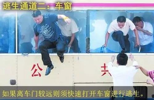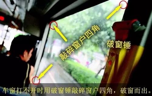 2、另一个救命出口:车窗 车窗可人为推拉打开时,远离车门的人应及时从车窗逃生。大巴车、空调车是密闭车窗,需用安全锤敲击车窗,注意:应敲击四个角,这样更容易敲碎玻璃。每辆公交都配有若干个安全锤,一般位于司机背后不远处和车窗旁边,乘客上车后可注意观察;若无安全锤,可用灭火器、皮带扣等一切可以找到的坚硬物体。