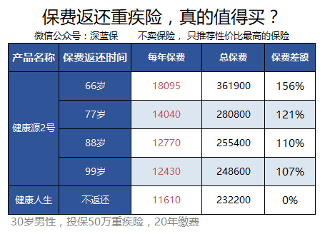 每次看到这种留言,基本就可以判断这位用户对于保险的认识很少,处于还没入门的阶段。 有的朋友在购买重疾险时,会认为到80岁的时候能返还保费的保险,一定比不返还的好,理由很简单,保险公司白给钱,只有脑子坏掉的才不要。 事实真的是这样吗,深蓝君以2份保障接近的重疾险为例: