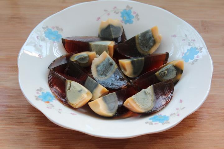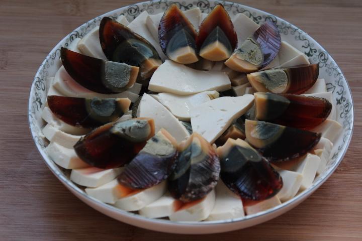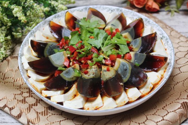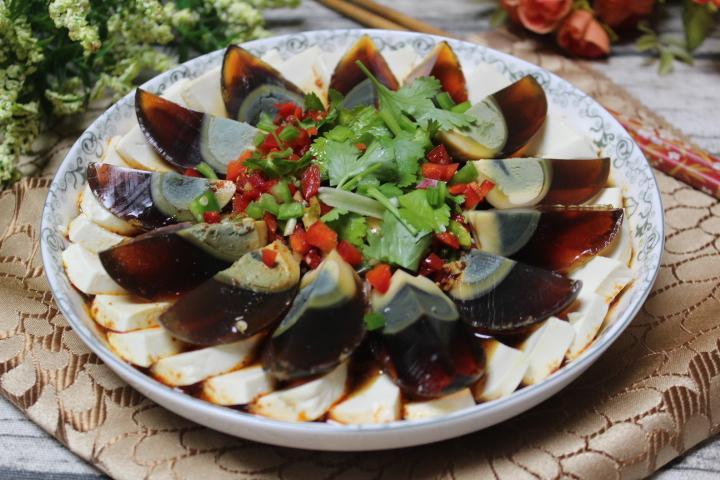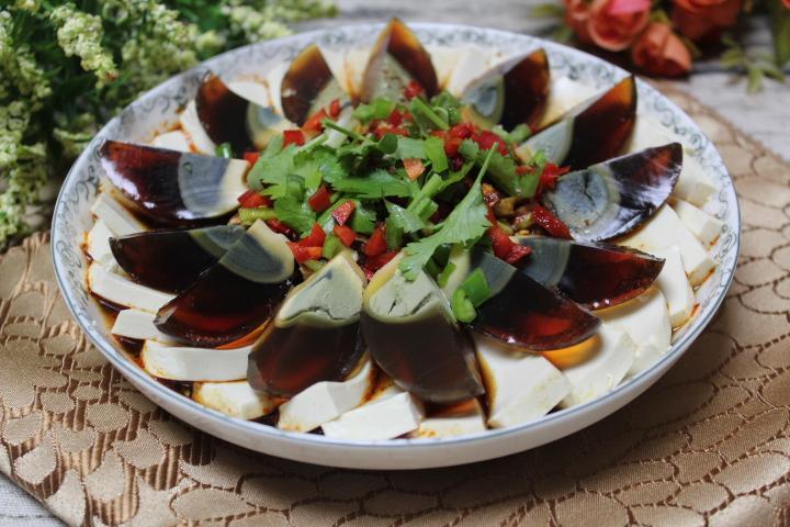 皮蛋豆腐这个菜比较清淡可口,是家庭常做的小菜之一,它不但取料方便,制作简单。营养更是丰富,不仅开胃味道鲜美,而且清热解毒,口感嫩嫩的,滑滑的,真是让人喜欢的一道菜。大多数人都认为这道菜只适合夏天吃,其实冬天吃也不错,皮蛋和豆腐都是清火气的。 食材:水豆腐1块、皮蛋4个、香菜1根、蒜粒3个、红绿椒半根就行、料汁:盐半勺、生抽1勺、醋1勺、白糖小半勺,辣椒油1勺。 做法: 1、将豆腐放入加了盐的开水中泡上两, 三分钟,小心地切成薄片。 2、然后一定要小心整齐的摆入盘中,其中操作中遗留的碎小豆腐可以摆至中心。 3、皮蛋去壳后洗净切成小块,切皮蛋的时候,旁边放杯凉开水,刀子沾点水切,容易切整齐。 4、将皮蛋摆放在豆腐上。 5、蒜,红绿椒切碎,香菜切小段。 6、用生抽,香醋,盐,蒜泥,白糖,调成一碗自己喜欢口味的酱汁,把红绿椒蒜末也调制里面,喜欢吃辣可以放一勺辣椒油。 7、将调好的料汁浇在上面,撒上寸段的香菜即可。 8、做起来也不难, 而且绝对是有面子的宴客级别的冷盘 。