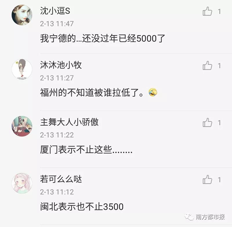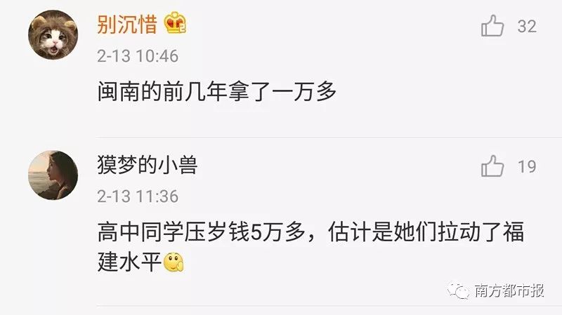 福建、浙江、北京 成为压岁钱支出水平最高的地区 福建孩子收到的平均单个压岁钱红包 高达3500元 福建2017年人均可支配收入为30048元 也就是说 福建人过年给孩子发三个红包 这一年三分之一的收入就没了 “记得从上学的时候开始,奶奶给我的压岁钱就固定在每年3000块了,一直给到我结婚。所以现在回想起来,如果考虑到物价因素,学生时代应该是我人生中最富裕的时光。”在上海工作的厦门网友莎莎这样调侃道,引来网友一片羡慕。