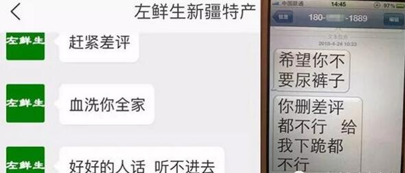 如今有些淘宝卖家简直无法无天了!去年12月郑州女子小蝶投诉遭淘宝卖家被千里追打导致全身多处软组织钝挫伤、脑震荡。就在昨天,淘宝又现言语威胁事件,郑州一50岁消费者给差评再遭网店威胁“血洗全家”:不弄死几个真不行。  下跪都不行? 淘宝卖家 你怎么那么厉害?! 4月25日,郑州市消费者李海峰(化名)向中国消费者报反映,他在淘宝网名为“左鲜生新疆特产”的店铺购买了几包干果,发现缺斤短两和瑕疵,在和商家沟通中产生了分歧,几番交涉,对方火气越来越大,竟然威胁他“如果差评,立马买机票,血洗你全家。” 此后,卖家居然给李海峰发来了购买的机票订单截图,并且发来信息,不断地威胁他,下跪都没有用。 此后,对方给李海峰发来了购买的机票订单截图,并且发来信息,不断地威胁他,下跪都没有用。李海峰选择了向商家所在地阿克苏市警方报警。 给差评被威胁“血洗全家” 事情究竟怎么回事?4月25日上午,50岁的李海峰向记者讲述了经过。4月15日,李海峰在淘宝网一家名为“左鲜生新疆特产”的店铺上,购买了两单巴旦木、葡萄干等干果。在收到货物后,他发现,几样产品都有不同程度上的“缺斤少两”,此外还有一些次品。  李海峰说,他联系商家,提出了自己的疑虑,没想到对方态度恶劣,并开始不断威胁。李海峰提供的淘宝网聊天记录显示,刚开始,双方都比较克制。李海峰对商品质量提出质疑,没想到,商家发来一个充满威胁的“案例”:“前天有个学生,收到我这里的蓝莓,说是假的。我给她解释她不听,把之前买的,一起给了三个差评,然后我买了别的3家店铺的同款,寄到了他们学校的政教处。”  感受到威胁的李海峰,表达了自己的不满。“我觉得这样的情况,我要给商家差评。”李海峰说。 在李海峰提出全部差评后,商家表示,“你这边差评,我立马(买)机票”。此后,是“想死的东西”“跟你客气把自己当个人”“快点蠢货”的谩骂。另李海峰没想到的一幕出现了:商家在聊天中催促李海峰去给差评,然后说出一句“血洗你全家”。  商家在聊天中还留下了一句话:你们这种买家,不弄死几个,还真不行。 商家买机票致威胁不断升级 只是因为给差评就被商家威胁“血洗全家”。气不过的李海峰还是给了商家差评。仅仅2分钟后,对方就发来了4月29日下午13点10分,“阿克苏—郑州”的机票订单截图,并贴出了李海峰的收货地址、电话等个人信息。  《中国消费者报》记者在李海峰提供的双方对话记录中看到,商家还提醒李海峰别忘了报警,并提供了自己的姓名、身份证号码。“别忘了报警。我叫左X,身份证号码6528271986XXXXXXX”。  4月24日上午10点33分,李海峰的手机收到两条短信“希望你不要尿裤子。你删差评都不行,给我下跪都不行。”  4月24日上午10点37分,感受到威胁的李海峰决定向淘宝网反映问题,并向店铺所在地,新疆阿克苏市公安局指挥中心报警。 4月24日下午13点56分,淘宝网消费者热线的员工打电话告诉李海峰,根据他的反馈情况,已经向上级进行了汇报,将根据调查结果向他进行反馈。 警方确认存在威胁行为 李海峰说,他现在战战兢兢,家里有老人,还有孩子,现在有人敲门都觉得害怕。“我向淘宝网反映了问题,他们要了截图,现在24小时过去了还没有回复。”李海峰说,经过多方联系,他几次将遭受“死亡威胁”的事情,向阿克苏警方进行了详细的讲述。 4月24日下午17点58分,一名自称阿克苏警方的侯姓警官联系了李海峰。记者在李海峰提供的对话录音中了解到,当地警方已经找到当事人,并且确认对方确实声称要“血洗全家”的威胁,同时,也确认左某确实购买了机票。 李海峰对警方的处理并不满意。“警方说只是通过文字威胁,并没有当面口头威胁,所以根据规定,够不上行政拘留处罚等。”李海峰告诉记者说,警方还告诉他,左某之所以定5天后的机票,是留有周旋的余地。 记者从双方的录音对话中还了解到,候警官表示,此次通话只是初步通报,将向有关法治部门咨询如何定性,将进一步根据调查结果,依法办理。 4月25日下午17点20分,李海峰告诉记者,阿克苏警方下午2次联系他进行沟通。 4月25日下午17点31分,记者致电淘宝网消费者服务热线,工作人员查询后向记者确认:“根据投诉工单记录,显示商家谩骂、骚扰买家,并且威胁杀死他。” 最新情况 4月26日下午17点17分,新疆阿克苏地区行署新闻办官方微博@阿克苏发布发布了情况通报:  4月25日,河南郑州消费者李海峰因网购与商家产生矛盾一事,阿克苏市场监管局、阿克苏电子商务协会及时对相关情况进行了调查。已协调关闭了其在淘宝网经营的网店,查封了其在属地开设的实体店。针对其涉嫌违法的言行,当地公安机关已介入调查并将依法处理。 感谢广大网友对此事件的关心,对阿克苏的关注。 阿克苏市市场监督管理局 2018年4月26日 那么此前不远千里 坐了一天一夜车到郑州殴打买家小蝶的店铺 又怎么样了呢? 千里殴打买家的店铺被关闭  去年12月27日15时许,小蝶接到自称某公司快递员的来电,她看是郑州的移动号码便未考虑真伪,随后来到通站路铁道安宁家园附近一家快递取件点时,一名男子突然冲出对她拳打脚踢起来。 事发现场的监控设施记录下了小蝶遇袭一幕: 当天15时她在快递取件点边走边找寻“快递员”,当接近一辆黑色SUV停放处时,一名穿深色外套、内穿浅色衬衣和条纹羊毛衫的