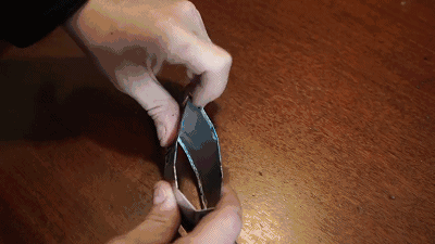首先,用美工刀将易拉罐两头裁去;接着剪开罐身,展开铺平,最后剪成两条长方形的铝片。