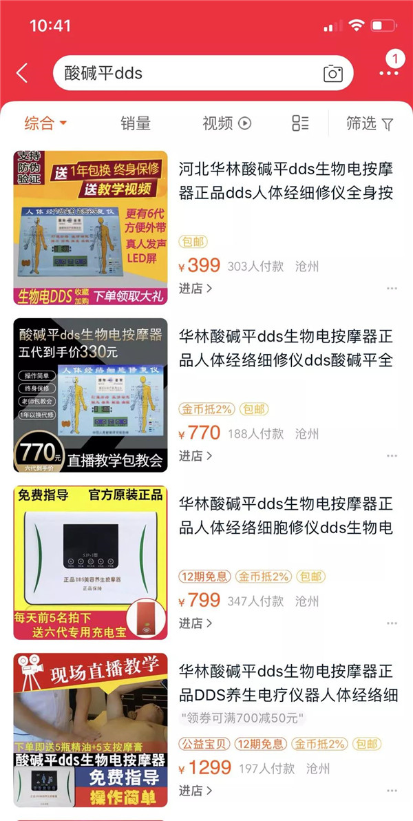 购买12500元产品就可加盟 1月13日下午,记者联系到了河北华林的一名经销商,提及有人质疑河北华林是“传销”。这名经销商说:“我不知道什么是传销。”随后反问:“要是传销,公司的10家总部是怎么做起来的?” 根据该经销商的介绍,加盟华林只需要购买12500元的产品即可,“一台仪器4980元,剩下的就可以全部买成产品。”他说,不是所有的产品都必须买,需要什么买什么,一次买不完,可以分两次,甚至三次来购买。 这名经销商表示,2012年他就开始接触河北华林的产品了,一开始是在其他人的店里帮忙,“自己做,也学技术。” 对于网上诸多的负面言论,他认为是因为网上的仿冒产品太多,“华林的产品从来不降价,也不在官网之外的地方卖,官网之外的产品都是假的。”他说,自己曾经的一个客户也想加盟华林,就花了1000多元从网上买了一台按摩器,“外观上看什么都一样,用起来感觉就不一样。” “从一开始到现在,我用了20多万的产品,如果产品不好,我能从2013年做到现在?”这名经销商说,他有个客户得了癌症,医生让化疗,但客户怎么也下不了决心,“我当时说,你把化疗的钱给我,我来给你做理疗。几个疗程之后,她去医院复查,体内的酸碱已经平衡了。” 这名经销商承认,公司确实有炒作的嫌疑,“现在做什么都需要炒作”。至于正在接受调查的权健,他觉得那是因为“他们太不地道了”。 问题产品网上仍有售 2019年1月13日上午,记者在京东上搜到了自称酸碱平DDS按摩器及系列产品,但所有产品都显示暂无报价,点开后显示“商品已下架”或者找不到数据的说明。 随后,记者又浏览了苏宁易购、唯品会、淘宝、考拉等网站后发现,唯品会、考拉上并没有出现河北华林的任何产品。苏宁易购上依然有自称华林酸碱平系列产品在出售,DDS按摩器型号从一代到六代,价格从1000余元到3000余元不等,而“狻戬平”牌按摩膏、按摩油的价格从几十元到上百元不等。淘宝也有不少商家在出售该系列产品,按摩器的价格从几百元到2000余元不等。