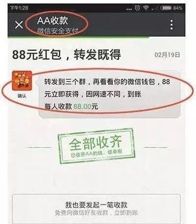 骗子套路:此类红包对微信AA收款界面进行了略微改动,加上“送钱”、“现金礼包”等字样,让用户认为是在领红包。