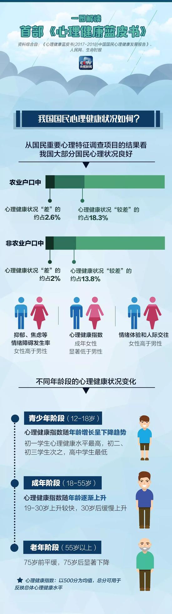 近日,中国科学院心理研究所、社会科学文献出版社共同发布了我国第一部“心理健康蓝皮书”——《中国国民心理健康发展报告(2017-2018)》。《报告》指出,我国仅少数人群存在不同程度的心理健康问题,但在不同年龄段、不同职业群体中,心理健康状况差别较大。此外,心理知识普及工作尚需加强,人们对“自我调节”等心理健康知识与服务需求巨大。