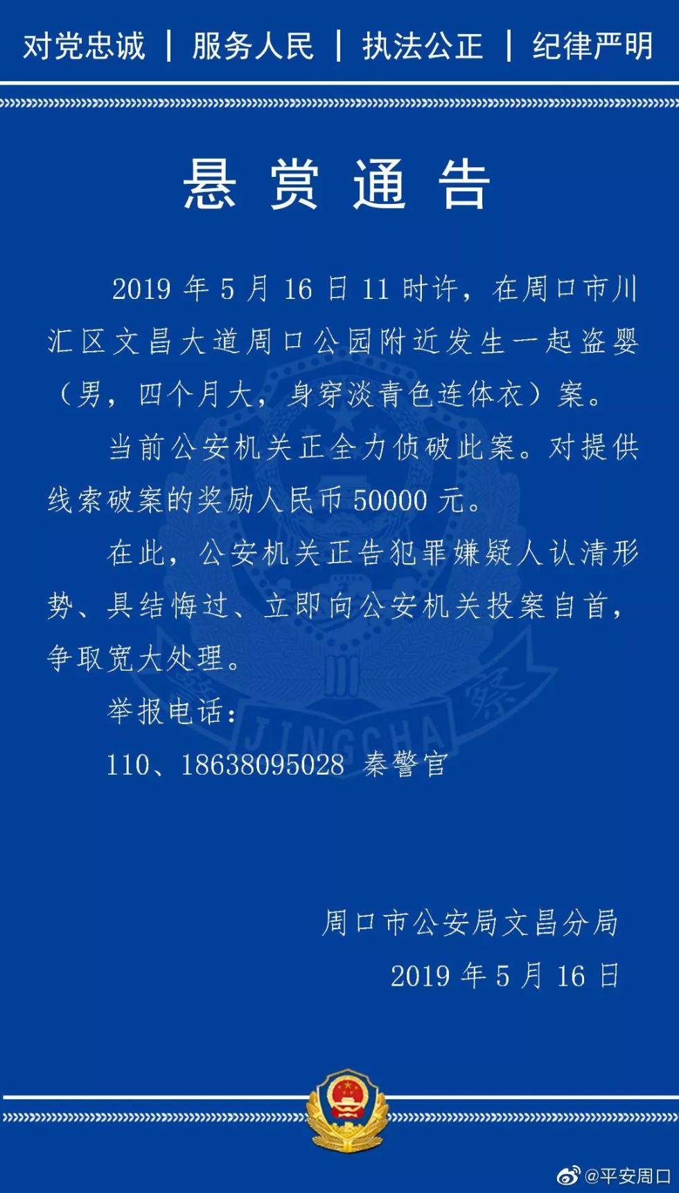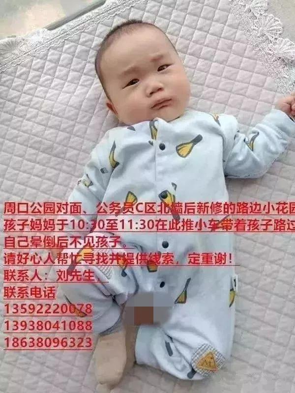 昨天上午10:30至11:30之间 孩子妈妈推小车带着孩子 路过周口公园对面的公务员C区北墙后 新修的路边小花园 突然晕倒 再醒来发现孩子不见了 据了解,孩子是4个月零25天的男婴,截至目前,孩子依然没有找到!孩子的母亲是二胎高龄产妇,宝贝的出生让他们家充满了欢乐。目前警方已经立案。如果您有孩子线索,请与孩子亲属联系!定重谢! 联系电话: 13592220078 13938041088 警方发布通告 河南周口警方昨夜连发两个警情通报,悬赏5万急寻盗婴嫌犯!公安机关正告嫌疑人认清形势、具结悔过,立即向公安机关投案自首,争取宽大处理!