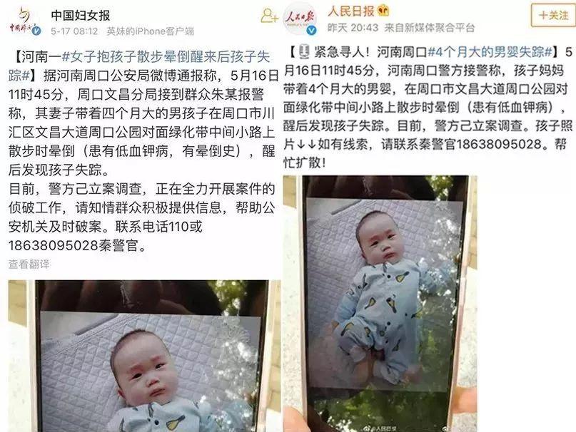 知情人告诉记者,孩子的父亲朱先生在周口市交警队上班,母亲刘女士(今年39岁)在当地一家媒体从事后勤工作,刘女士和朱先生系高中校友。 夫妻俩的邻居田先生告诉记者,夫妻二人平时为人和善,也没有得罪过任何人。 据男婴父亲朱先生介绍,丢失的孩子叫朱重晔,年龄才4个多月。5月16日上午,孩子由其母亲带着外出。上午10时30分至11时30分之间,孩子母亲因身体虚弱晕倒,等醒来后,孩子就不见了踪影。 “孩子才那么大,连饭都不会吃,我们都急坏了。”5月16日下午6时许,男婴的父亲朱先生说,经过六七个小时的查找,孩子目前还没有线索。而警方刑侦部门也已介入此事,目前正在积极工作中。 孩子一位从医的亲属告诉记者,虽然孩子的母亲身体虚弱,之前有眩晕史,但正常情况下晕倒10分钟左右。这一次,从晕倒到被发现叫醒,达到1个小时。这位亲属怀疑,可能是被人为下药迷晕的,是专业偷小孩的所为。 孩子母亲晕倒地点 周口市公安局文昌分局发布通告称,警方已立案调查,正在全力开展案件的侦破工作,请知情群众积极提供信息,帮助公安机关及时破案。联系电话110或18638095028秦警官。 在此,警方正告犯罪嫌疑人幡然悔悟,停止犯罪行为,立即向警方投案自首,争取宽大处理。公安机关对此案正在全力侦办中,请广大网民不要传播未经核实的信息,警方侦破进展情况会在第一时间向社会公布。 官媒、明星全国爱心传递 扩散急寻孩子的呼吁 已遍布全国十三个省市 近千万网友转发帮忙找孩子 人民日报、中国妇女报为爱发声 ↓↓↓