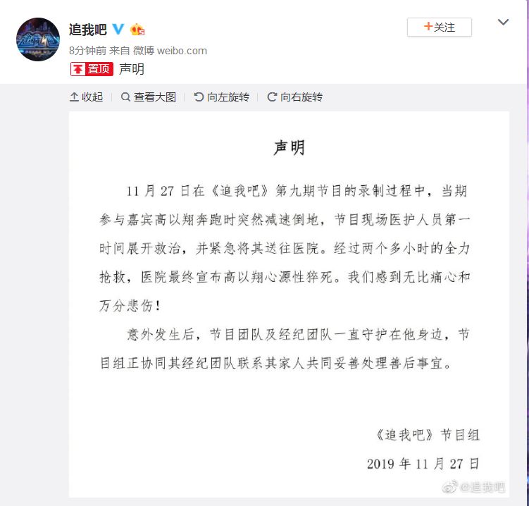 刚刚,《追我吧》节目组发布声明,称高以翔在录制节目中心源性猝死。