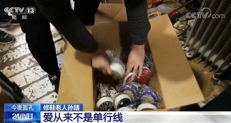 当记者问孙靖,忙不过来也没请个帮手,是不是怕花钱的时候,老人说,他只招贫困家庭的学徒,而且学费全免 。4年间,他通过媒体广告、当地社区招来十多位学徒。 修鞋老人 孙靖: 特别困难的,我肯定不要学费,路费我都给。  不仅如此,凡是来店里修鞋的老人、残疾人、环卫工,孙靖也一律免费 。 爱从来不是单行线 德不孤,必有邻。经常有人隔三差五给孙靖送饭、送水果,有人送来电暖气、电脑,这些都让孙老先生很感动,但他最喜欢的是个纸箱子。这是为残疾学校募集鞋的“项目”,由退伍军人赵海龙提供。因为常在老人这修鞋,一来二去熟悉了,赵海龙有了将旧鞋回收再利用的想法。 退伍军人 赵海龙: 今年上半年,通过孙老师傅捐了30双给陕西省残疾学校。他刚好又攒了一部分鞋,别人不要的鞋,他缝缝补补修好了,我这边联系捐赠。