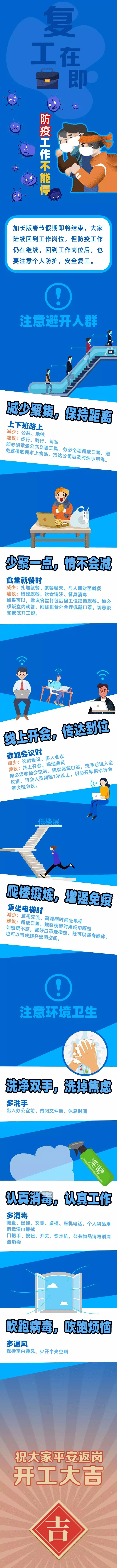 春节假期即将结束,不少单位陆续有人进入复工状态。但疫情防护工作还不能结束。 此前,钟南山院士曾在接受采访时表示:如果工作者在这期间必须返岗参加工作的话,有3个细节务必注意。 南都记者 摄 钟南山院士强调 大家尽量减少出行! 发热 仍然是新型冠状病毒感染的 典型症状 传人有个潜伏期 发病的潜伏期正在进行更准确的评估 可能是3到7天 一般不超过14天 如果必须返岗 参加工作 请注意以下事项 1 办公场所高危地带务必戴口罩 最高危:电梯间 电梯间内,空气极其不流通,人流量也最大,需要高度重视。 而且电梯间的危险是无形的 刚刚有人咳嗽或打了喷嚏后离开 但你却以为走进了 空无一人的“已消毒”电梯间 普通的外科口罩,它并不能够制止冠状病毒的进入,因为它的颗粒很小。但戴口罩是有用的,因为口罩是防止飞沫的传染,而这个冠状病毒主要是附着在飞沫上,它不会自己飞来飞去的。这些措施是合适的。 钟南山 你的工作生活场合 充满了飞沫 包括你按电梯按钮的手指 也沾满了飞沫 建议 1、搭乘电梯一定要戴口罩。 2、不直接触碰电梯按钮,建议用纸巾隔挡按键。 3、有条件的单位一定要频繁为电梯间消毒,特别是按钮区。 次高危:饭堂/餐厅 饭点时,大量人群涌进饭堂,此时是人流量最大,密度也最高的区域。 建议 1.坐下吃饭的最后一刻才脱口罩。 2.错峰就餐,避免面对面就餐,避免就餐说话。 3.打包回工位单独用餐。 第三高危:办公室 办公室内人来人往,基本为固定人员流动,虽然危险性较小但仍需重视。 建议 1、佩戴口罩,谈话保持适度距离。 2、办公室内保持良好通风。 3、对经常接触的办公用品进行酒精消毒。 2 洗手 洗手 洗手(重要的事情说三次) 1.到单位,第一时间洗手。 2.吃东西前,先洗手。 3.到过电梯间,饭堂高危区的,回来洗手。 4.外出回来,马上洗手。 5.要接触自己面部,特别是鼻孔与眼睛前,先洗手。 3 科学正确的酒精消毒 1.像香水那样将消毒水洒在自己身上是没有意义的,重点是对我们手部会接触到的部位与物件进行消毒。 2.酒精消毒要喷洒覆盖物件,自然晾干即可,不用擦拭。 如:手机,门把手,电梯按钮,鼠标键盘,自行车把手,工作证,文具,椅子等。 更多复工防护指南 看这里 众志成城,共抗疫情 在疫情期间,我们都心系抗疫前线,我们希望所有人都平安健康,如若不幸感染了,我们希望大家团结一致,众志成城,共抗疫情。 或许我们不能在前线奋战, 但是我们每个人都可以用自己的方式, 为疫情出一份力: 哪怕仅仅是不出门、不聚会、勤洗手、戴口罩...... 理智面对疫情,不信谣言,不恐慌! 而你的一份善意,你的一句“加油”, 也都是战胜困难的力量! 新型肺炎临时互助社 ↑轻轻一戳,立即加入↑ 【不限年龄,未感染2019年新型冠状病毒的人可加入】 【如不幸感染,可享康复补贴+身故抚恤金,最高12万】 新型肺炎临时互助社 ↑轻轻一戳,立即加入↑ 欢迎转发给好友或分享到朋友圈