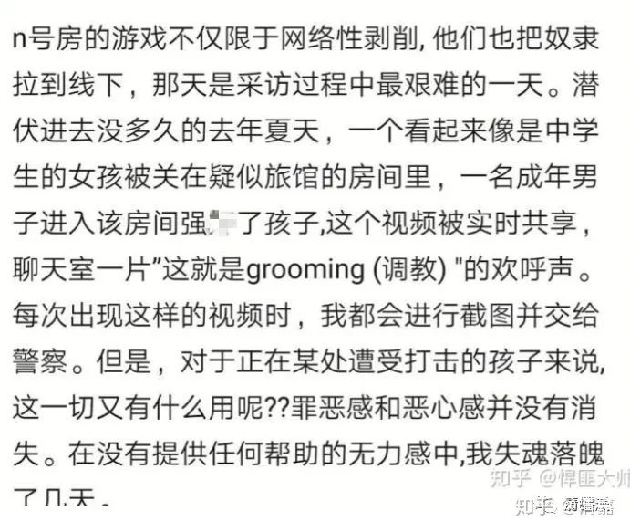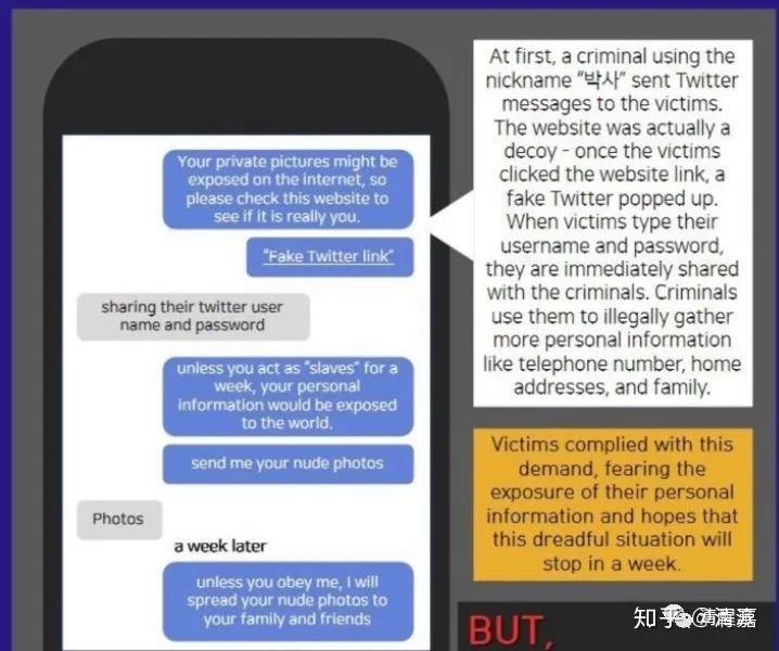 01 地狱之门打开:何为 N 号房间? 2018 年,一位名为「godgod」的韩国高中男生,在一个叫做「Telegram」的社交平台上开设了共计 8 个聊天房,按照 1 号房、2 号房的顺序命名下去,开始传播女性的性剥削视频。 这便是 N 号房间名字的由来。 三个韩国男子(godgod、Watchman、博士)会 用各种各样违法的方法来骗取未成年女性的私人信息。 受害者被称为「奴隶」,最小的只有 11 岁,受威胁拍摄各种淫秽物品。 一开始,这个叫做博士的人会在推特上发送私信给这些女性,和她们说: 「你的私人信息被暴露在网络上了。所以你快点击下这个链接看看这些照片是不是你。」 但其实,这个链接就是个 钓鱼链接。 一旦这个女生点进去链接之后,就会有个假推特网站跳出来,要求女生填写自己的登录名称和登录密码,甚至用这个方法得到她们的电话号码,家庭住址,和家庭关系。 这个时候,更过分的威胁就开始了。 博士会威胁她们说,如果你不在这一周内把自己扮成「奴隶」,你的所有私人信息就会公之于众,并且要求这些女性发送自己的裸照。如果不服从就要告诉父母。 这些被胁迫的女性因为很多都是未成年少女,自我防范意识不高,又害怕自己的信息被曝光,只好发了自己的裸照。 从这些女生交出自己裸照的那一刻开始,就相当于打开了地狱之门。 只要这个女生选择不服从他们的命令,就会把该女生的朋友清单发给她,威胁她如果不听话,就会告诉所有人。 女孩害怕这些事情暴露,就选择继续服从。 除了这种链接诱骗,还有的就是会 通过聊天骗女性进行「手机兼职」。一旦拿到裸照之后就开始进行下一步更过分的胁迫。 博士他们不仅要求线上拍摄视频, 甚至会把未成年女孩子们带到线下进行强*,并在社交媒体上进行直播。 超过 26 万人正在狂欢。那里,就是 N 号房间。 02 超过 26 万名「加害者」 在这次事件中,有超过 26 万个账户在观看那些残忍的视频。而实际人数绝对会远远大于 26 万人。 让人害怕的不仅仅是那位「博士」的行为,而 是超过 26 万的人观看,却只有 2 个人对其进行举报。 韩国人口的 官方数据是 5164 万人,什么概念?这几乎相当于每 100 个韩国男子里,就有 1 个人进过这个聊天室;或许过一个马路都能与他们擦肩而过。 根据韩网报道,受到加害的韩国女性超过 1 万人。 后来,是两个韩国大学生,在聊天室内潜伏了 6 个月,收集了足够多的证据,才将这件事进行了曝光。 知友 tszshanhuang用一张图总结了这次 N 号房事件: 从 2019 年初开始,这样的聊天室在社交网站 Telegram 就开始急速增加达到了数十个。 女教师房,女军人房,女警察房,女中学生房比比皆是…… 这些聊天室阅后即焚,不断出现又消失,但是最令人发指也是最变态的就是上面描述的博士房。 03 疯狂「盈利」的 N 号房 他们会要求想要进入房间观看视频的男性进行会员注册。会员分成等级制度,根据视频过分程度要求男性进行注册。 其中第一阶段(最轻级)的会员注册需要缴纳 25-30 万韩元的费用(相当于 1500 人民币左右),第三阶段是 150 万韩元(相当于 8500 人民币左右),如果要看最过分的内容,就可能不是钱能搞定的事情了。 想要进入 N 号房,不仅可能需要缴纳钱,更可能的是,博士和其他运营方会要求男性也拍摄类似的视频上传,进行共享。 如果不上传的话,就会被强制退出房间。 就是这样的方式,N 号房上传视频的人越来越多。 一个聊天室一天内 甚至 可以上传超过 1.5 万条不良信息。 如果视频确认是本人亲自拍摄的话,就有可能可以得到 N 号房的 free pass。 还有人为了上传视频,就直接威胁自己身边的女性,把她们的照片 P 成裸照,或者写一些羞辱的小说。 而在聊天室里,这些男人对女性的称呼,都是「XX 狗」,或是「来月经的东西」。 他会要求所有被害的女性用刀在自己身上刻「奴隶」和「博士」等字样,来证明这些女人是他制造出来的奴隶。 04 魔鬼身份公开:25 岁,信息通信专业,成绩优异 目前报警的受害者共有 74 人,16 名未成年。 随后,边伯贤、朴灿烈、李惠利、白艺潾、河妍秀、文佳煐等 韩国艺人们开始纷纷发声,要求公开「N 号房事件」的加害人身份信息。 目前参与请愿要求公开该嫌犯信息的人数已经达到 370 余万人。 3 月 23 日,韩国 SBS《8 点新闻》公开 N 号房事件「博士房」运营者长相和身份信息。 此人 25 岁,在校期间成绩优异,4 个学期中 3 个学期平均学分 4.0 以上,信息通信专业,曾作为学报编辑部编辑局长活动。 他还曾在某个帮助残疾人的团体里积极地进行志愿活动。有认识他的人说:「他看起来很平凡,很善良。」 就是这样一位看似「善良」之人,背地里却是个不折不扣的变态魔鬼。 05 每一个进入过房间的人,都是杀人犯 这次事件中,多数是未成年人。罪犯深谙受害者的心理——宁愿忍气吞声,一次次地被威胁,也不愿意报警。 为什么?因为在报警后,面对的是被公开的隐私、亲朋好友的疏远和责骂、还有世人的冷漠与偏见。 这些「受害者有罪」言论,把伤口定义为耻辱,定义为不能被揭开的丑闻;为无数罪犯提供了那把利剑,狠狠地刺入无数被害人的身体和精神中。 此外,真正让人感到无比气愤的是这一段话: 「我又没有犯罪,我只是正当的付费观看了成人内容,这难道是错误的吗?比起处罚 N 号房的参与者,更应该从上传自己身体视频的人开始处罚。如果她们不上传视频,就不会有 26 万受