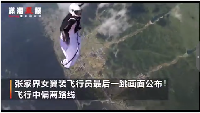 翼装飞行失联女生最后一跳画面曝光, 以非正常飞行姿态急剧下降数百米 5月12号上午,女翼装飞行员从直升机一跃而下,摄影师随后跳出跟随飞行。平稳飞行了19秒后,摄影师发现女翼装飞行员的飞行路线明显偏离,飞行高度有所下降。两人正快速向天门山台型主山体方向飞行,摄影师判断女飞行员可能无法正常通过山顶上空,立即挥手示意女翼装飞行员开伞。随即摄影师也调整飞行姿态,绕过山体安全返回降落点。摄影师在无法继续跟随飞行的瞬间,向侧下方回头看了一眼,发现女翼装飞行员已经以非正常飞行姿态急剧下降数百米,随后脱离摄影师视线和可拍摄范围。