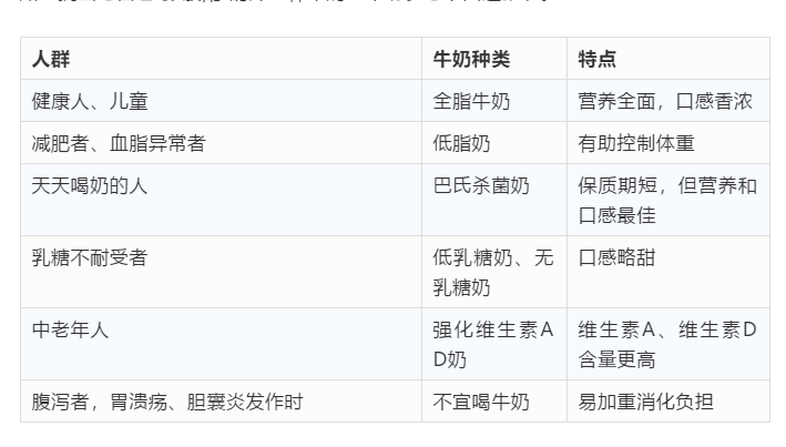 在漫长的人类饮食史中,牛奶可以说是水之外的另一重要饮品。不管男女老少,牛奶拥有全年龄段的“粉丝”。 去超市里逛逛,货架上各种牛奶一字排开:鲜牛奶、高钙奶、低脂奶、早餐奶……这些不同的牛奶有什么区别? 不同牛奶有何不同? 牛奶的分类方法有很多,比如按照灭菌方式分巴氏奶和常温奶 ,按脂肪多少分全脂奶、低脂奶和脱脂奶,按乳糖高低又有低乳糖奶、无乳糖奶等…… 近几年市场上又出现了一些新概念的产品,比如A2β-酪蛋白奶、透明袋牛奶等。面对货架上一大批各色牛奶,该怎么选呢? No.1 常温奶 常温奶(超高温灭菌乳)是采用超高温瞬时灭菌技术生产加工,并灌装入无菌包装内的牛奶。 瞬间灭菌在杀灭细菌和微生物的同时,能够最大限度地保护牛奶的营养和口味。常温奶通常采用无菌复合纸包装,无需冷藏和防腐剂就可以使牛奶在常温保存较长时间。 相比巴氏灭菌奶,常温奶会损失一些叶酸和B族维生素。 No.2 鲜牛奶 鲜牛奶通常指的就是巴氏杀菌乳,它跟常温奶相比,因为灭菌温度比较低,风味口感更佳,营养(如维生素B1)也保留得相对好一点。 但就补充蛋白质和钙而言,两者没多大区别。 鲜牛奶保质期短,一般为2~8天,需要放冰箱里冷藏,适合平时购物方便,也方便冷藏食物的人。如果条件不允许,买常温奶就够了。 No.3 低脂奶 普通牛奶的脂肪含量约为3%~4%,而通过脱脂工艺降低牛奶中脂肪含量得到的产品便是低脂、脱脂奶。 脱脂工艺难免会损失牛奶中一些脂溶性的营养物质及香气。目前市面上低脂奶的脂肪含量一般在0.5%~1%,脱脂奶的在0.5%以下。 - 健康人群没有必要为了控制脂肪摄入而选择低脂奶。