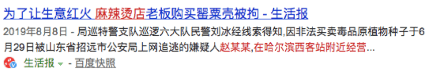 后来被执法检查发现,宋某在其经营的饭馆内制售含有非法添加罂粟粉末的火锅底料,抽样火锅底料中含有吗啡、可待因、那可丁。 · 2019年8月,据生活报报道,赵某某在哈尔滨西客站附近经营一家麻辣烫店,为了让自己的麻辣烫店生意好,他从外地进罂粟壳作为辅料加到麻辣烫里。2019年7月,民警前往该麻辣烫店将赵某某抓获。 2017年11月,浙江台州温岭市人民法院召开新闻发布会,通报了两起商家违法添加罂粟的案例。