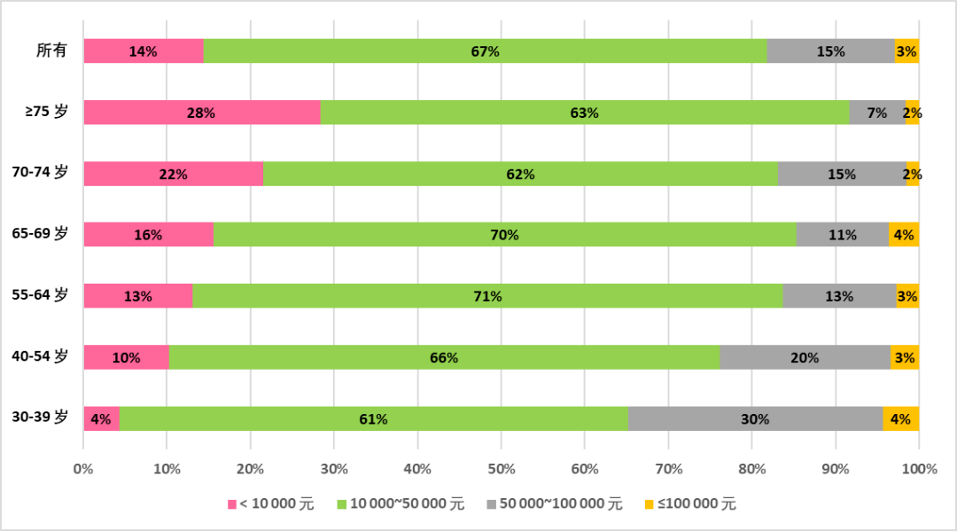 - 按年龄分段来看,老年患者借款超过5万元的患者比年轻患者更低:40-54岁的患者中有23%的人借款超过5万元,75岁及以上的患者中仅9%的人借款超过5万元。