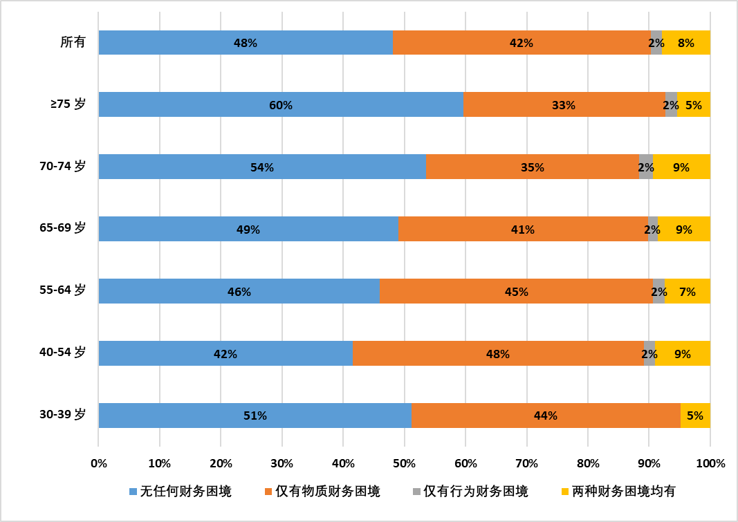作者解释说,中国的儒家孝道文化根深蒂固,子女会为老年患者支付医疗费用,这在一定程度上解释了年轻和老年癌症患者出现财务困境的差异。 不同年龄组经历癌症相关财务困境比例