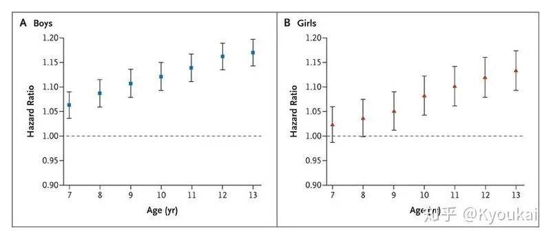 但实际上,青春期肥胖也与年纪大以后的心血管疾病风险相关: 每单位 BMI 对于不同年龄男女生成年之后(25 岁以上)心血管事件风险提升 7-13 岁的孩子,在 10 多年以后,也不到 30 岁,听起来是不是跟老年病还远得很?然而那些 BMI 严重超标的孩子在这个年龄已经心脏病发作多次了