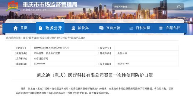 重庆:据重庆市市场监督管理局官网7月3日消息,凯之迪(重庆)医疗科技有限公司按照《消费品召回管理暂行规定》的要求,向重庆市市场监督管理局报告了召回计划,将自即日起,召回2020年04月07日期间制造的型号为17.5×9.5cm的一次性使用防护口罩,涉及数量为3160盒。