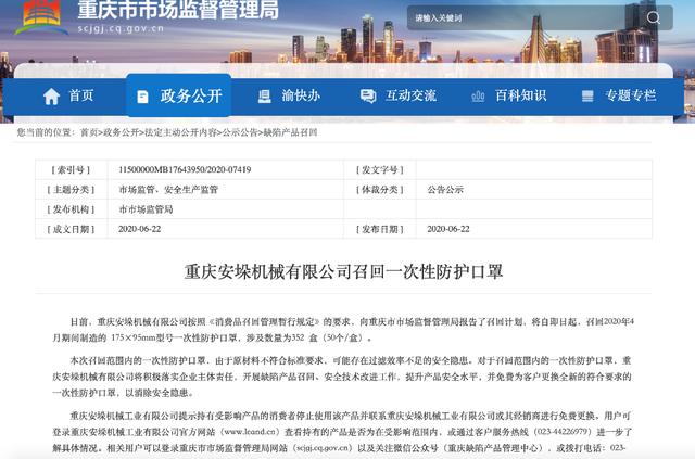 本次召回范围内的一次性使用防护口罩,由于供应商提供的原材料原因,产品存在过滤效率和防护效果不足的安全隐患。凯之迪(重庆)医疗科技有限公司提示持有受影响产品的消费者停止使用该产品并联系凯之迪(重庆)医疗科技有限公司或其经销商进行免费更换。 据重庆市市场监督管理局官网6月22日消息,重庆安垛机械有限公司按照《消费品召回管理暂行规定》的要求,向重庆市市场监督管理局报告了召回计划,将自即日起,召回2020年4月期间制造的 175×95mm型号一次性防护口罩,涉及数量为352 盒(50个/盒)。 本次召回范围内的一次性防护口罩,由于原材料不符合标准要求,可能存在过滤效率不足的安全隐患。重庆安垛机械工业有限公司提示持有受影响产品的消费者停止使用该产品并联系重庆安垛机械工业有限公司或其经销商进行免费更换。