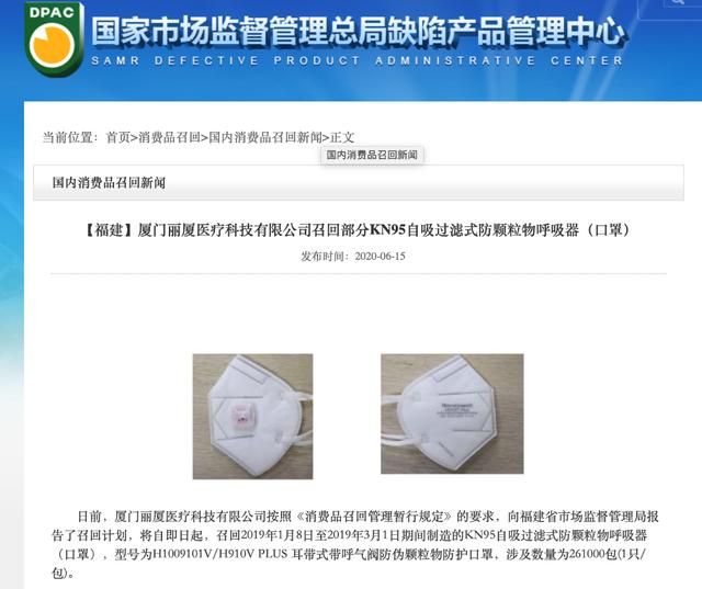 福建:据福建省药品监督管理局官网6月5日消息,福建惠丰药业有限公司报告,由于一次性使用医用口罩非无菌(注册证号:闽械注准20202140141)使用的最小销售包装外标签与产品注册证内容不完全一致,该问题不符合相关规定要求,但不会对人体使用造成任何影响,目前也未收到任何因为该问题而引起的投诉或不良事件,但为了符合标准要求,该公司研究决定,对不符合要求的产品实施召回,并对该问题进行纠正。 涉及产品批号为202003004和202004001,共30000片。 据福建省市场监督管理局官网消息,厦门丽厦医疗科技有限公司按照《消费品召回管理暂行规定》的要求,向福建省市场监督管理局报告了召回计划,将自即日起,召回2019年1月8日至2019年3月1日期间制造的KN95自吸过滤式防颗粒物呼吸器(口罩),型号为H1009101V/H910V PLUS 耳带式带呼气阀防伪颗粒物防护口罩,涉及数量为261000包(1只/包)。