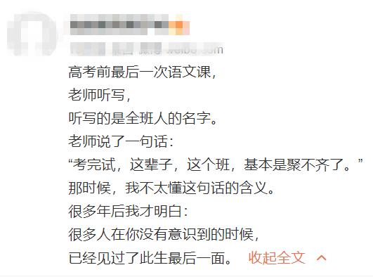 又是一年毕业季, 有很多人高中毕业了, 也有很多人大学毕业了。 在这个毕业季节, 在微博上看到一句话,特别伤感: “高考前最后一次语文课, 老师听写, 听写的是全班人的名字。 老师说了一句话: ‘考完试,这辈子,这个班,基本是聚不齐了。’ 那时候,我不太懂这句话的含义。 多年以后我才明白: 很多人在你没有意识到的时候, 你们已经见过了此生最后一面。” 记得我高三那年也是这样, 高考之前,大家相约, 考完之后一起玩通宵, 结果没有。 很多人,那天是最后一面, 我当时竟然没有意识到。