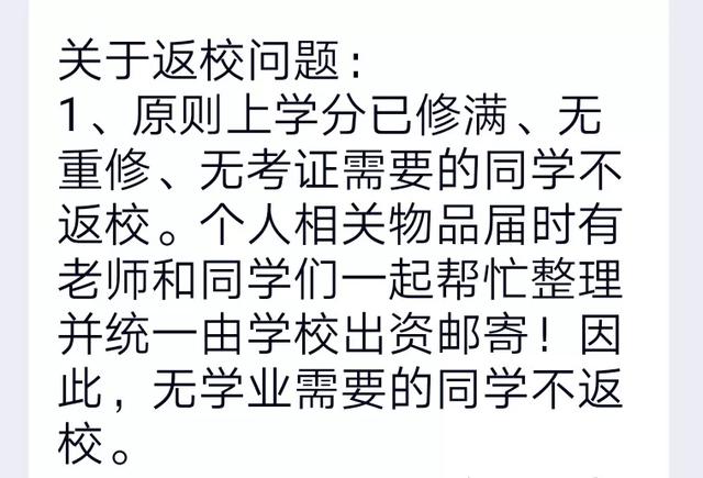 某大学发了一个通知: “原则上学分已修满, 无重修、无考证需要的同学不返校。 个人相关物品, 届时有老师和同学一起帮忙整理, 并统一由学校出资邮寄。 因此,无学业需要的同学不返校。”
