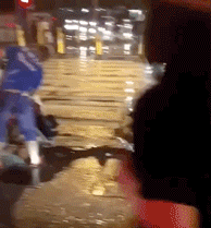 大雨突降的夜晚。 送餐小哥发现一位坐轮椅的老人,赶忙停下车,把自己的雨伞和雨衣拿给老人,仔细确认老人不会被淋湿后,他才赶忙冒雨继续送餐。