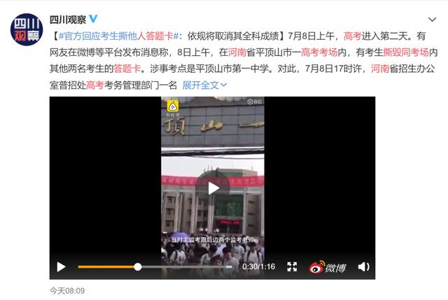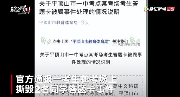 事后,据知情人透露,共有两名学生答题卡被撕。而女生的理由仅仅是,自己考得不好,压力太大,需要发泄。 当有人问你为什么没撕自己的答题卡时,女生沉默了,没有说话。 最后,经上报平顶山市招办批准,部分学生延时进行答题。而那个女生被取消了全科成绩。