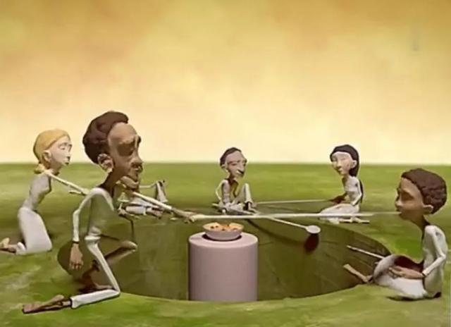年轻人惊讶地发现,地狱里,一群人围着一大锅肉汤,却饥肠辘辘,瘦骨嶙峋。