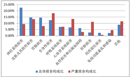 2019年注射不良反应事件报告中,累及器官系统排名前5位的是皮肤及其附件损害、胃肠损害、全身性损害、神经系统损害、心血管系统损害。 2019年心血管系统用药不良反应/事件累及器官系统情况