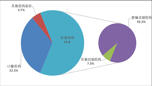 从最新发布的《国家药品不良反应监测年度报告(2019年)》中,按照给药途径统计,2019年药品不良反应/事件报告中,注射给药占62.8%、口服给药占32.5%、其他给药途径占4.7%。注射给药中,静脉注射给药占92.5%、其他注射给药占7.5%。