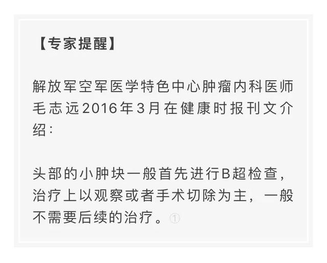 头部出现小肿块,大部分是良性的,包括:脂肪瘤、表皮囊肿、纤维瘤、血管瘤、神经鞘瘤等,可根据肿块的软硬、活动度、颜色、疼痛、质地有个初步的判断。