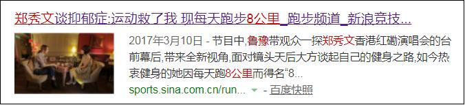 歌手郑秀文就曾深受抑郁症困扰,曾在《鲁豫有约》的采访中她表示是“运动救了我”。她每天都会都会坚持跑8公里健身。