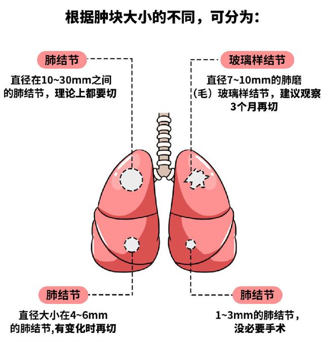 肺部出现结节 基本都是肺里受到伤害导致的 比如吸入过多烟、雾霾等灰尘 肺部受到创伤和感染 或是有肺炎、肺结核等 但千万别以为发现了肺结节就是癌症在召唤 据统计,肺结节90%以上是良性的 真正恶性的比例只有1.2% 肺部小结节大部分由良性疾病引起 小于6 mm肺结节,是肺癌的概率不到1% 直径在6~8 mm之间的肺结节,肺癌概率在0.5%~2% 直径大于 8 mm的肺结节,肺癌概率大于3% 查出肺结节该不该切?主要看大小