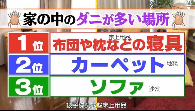根据上述日本实验的“家中螨虫数量排行榜”,螨虫最多出现在被子枕头等床上用品里,第二位是地毯,第三位则是沙发,基本都与布料、织物有关。 螨虫喜欢寄居在床垫、地毯、枕垫、坐垫、凉席中,换季时最好及时除螨。 夏季很多家庭都会使用凉席,武汉市中心医院皮肤科主治医师和义敏提醒: 不管哪种材质的凉席,一旦“超龄服役”就容易滋生细菌和螨虫,引起过敏,特别是老人、孩子及孕妇等体质较弱人群,所以过了保质期要尽快更换。 真正有效的4种除螨法 东南大学附属中大医院皮肤科博士董正邦表示,很多人认为开水能烫死螨虫,其实,只有达到足够的温度和时长才能产生效果。 另外,东京环境过敏研究所的实验发现,日晒6小时后,被褥上螨虫等有害物质残存率仍高达96.2%。 螨虫很“聪明”,会躲避到不那么热的背阳面,所以晒太阳除螨不一定有效。 1 除螨仪 效果指数:★★★★★ 价格指数:★★★ 方便指数:★★★★ 中国家用电器研究院测试计量研究所所长鲁建国介绍,螨虫听觉神经脆弱,除螨仪的超声波技术会干扰其生理系统,令其逃离或死亡,降低环境中螨虫浓度。 另,除螨仪的机器内都会配有集尘盒,杀死的螨虫能被吸到集尘盒里,不用担心遗留。 中国家用电器检测所曾做过一项检验显示,除螨仪的总去除率高达99.36%。 家中有哮喘、鼻炎或其他呼吸系统疾病的人,建议配台除螨仪。可选择:体积小、方便拆卸的,以及高频和吸力强的。 2 防螨床罩 效果指数:★★★ 价格指数:★★★★ 方便指数:★★★★★ 北京协和医院变态反应科主任尹佳表示,使用防螨抗菌纺织品确实能在一定程度上预防病菌通过织物传播,对防治因螨虫造成的过敏、湿疹、皮肤病有良好的效果。 她说:“防螨床罩主要通过提高织物密度来防止螨虫侵入。此外,也有一些有防螨作用的床上用品,会在纺织过程中采用喷淋、浸轧、涂层等技术加入冰片衍生物、脱氢醋酸、拟除虫菊酯类等防螨剂,以此抑制螨虫侵入和繁殖。”