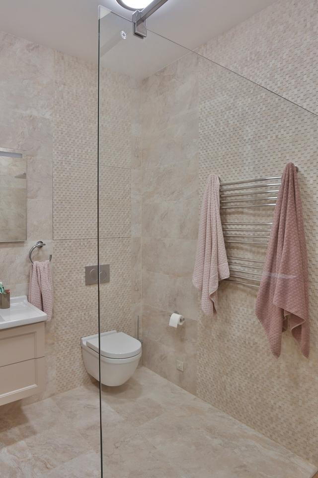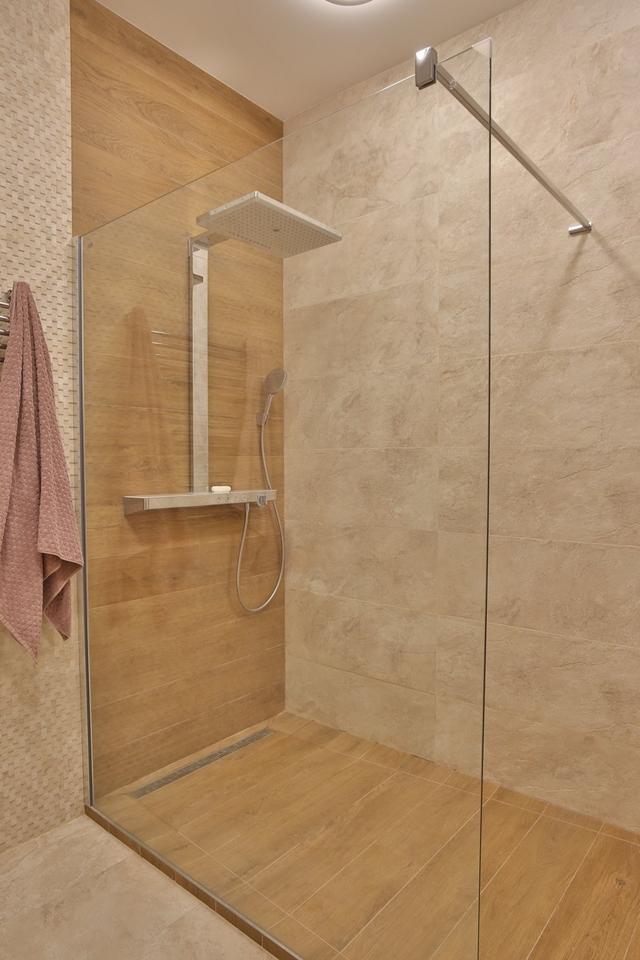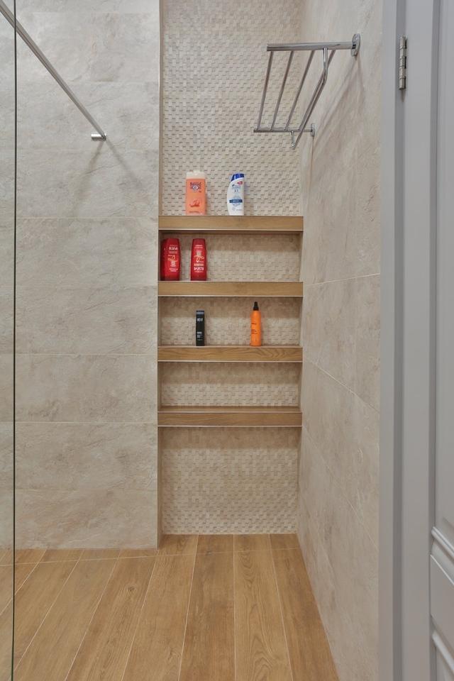 淋浴区内嵌的墙面刚好利用起来,多砌加个小平台,也能放下洗发精、沐浴露,省得再挖洞打壁龛。