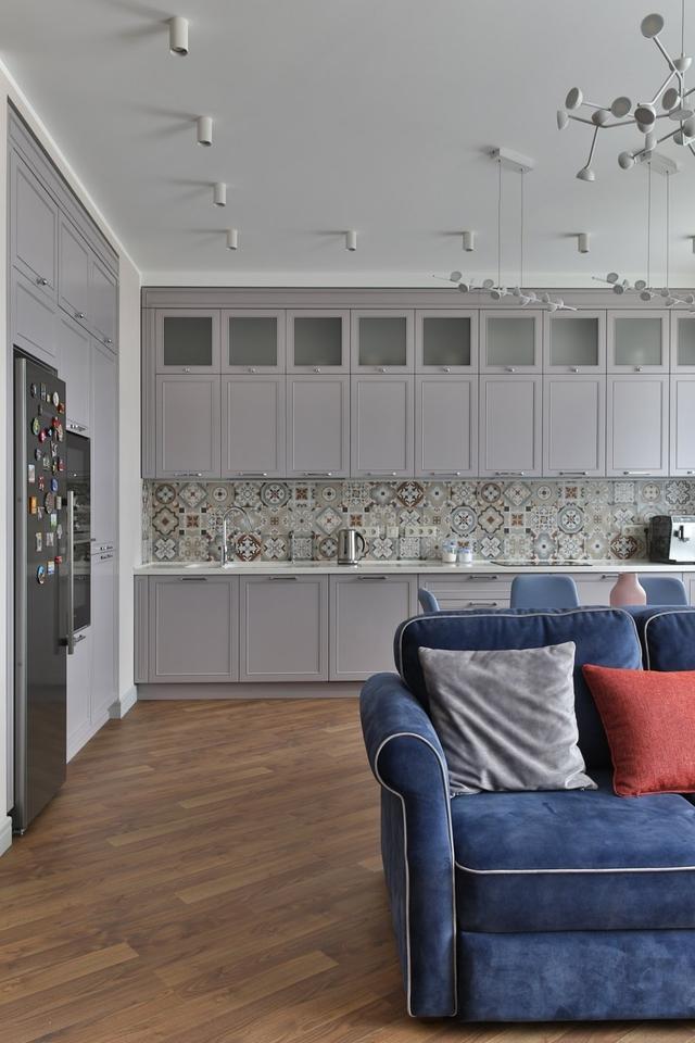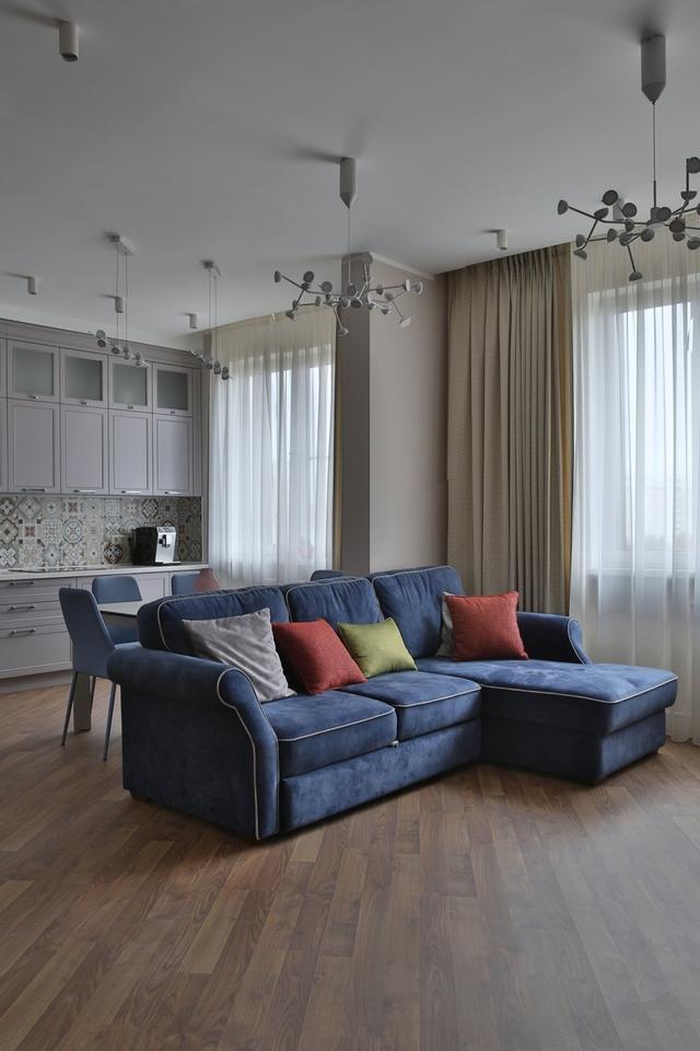沙发后面就是餐桌和厨房,中间的墙垛不能砸,干脆靠着放沙发做延伸,也不会显得过于突兀,与沙发同色系的餐桌藏在后面,也不会显得格外突兀。