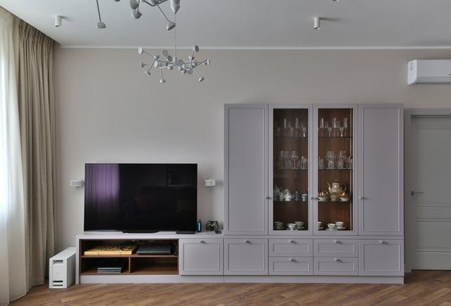 无主灯的设计,保证晚上家里每个角落都是亮堂堂的,电视柜是连着大高柜一起做的,所说没有装到顶,但是收纳能力同样不容小觑,局部的玻璃柜门拿取一目了然,放些杯具、茶具等再好不过了。