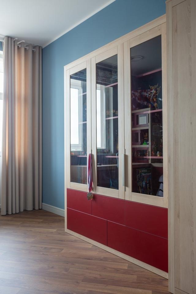 衣柜没有打满墙,旁边多加了个立柜,收纳孩子的玩具、书籍,这样也省得摆在地面上到处都是。