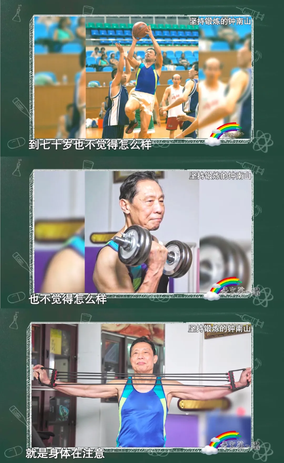 在“开学第一课”现场,年过八十依然身形矫健的钟南山,向同学们分享了自己的健身之道。他号召大家要从小要注意锻炼,有一个强健的体魄,从而可以更好地实现自己的理想,报效祖国,为社会做出贡献。
