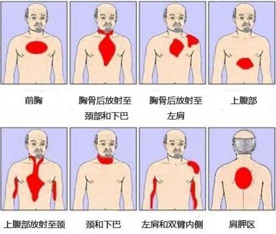 人的内脏有肋骨的保护,所以疼痛定位不会像皮肤表面那么准确,心梗时表现出来可能是胃疼、牙疼、嗓子疼、肩膀疼。 出现上图所示部位疼痛,以及这些症状,应马上就医: