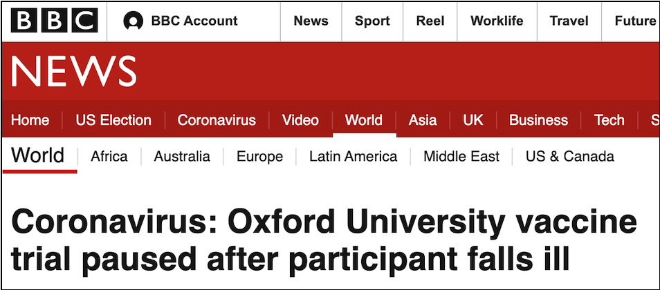 - 9月9日,由英国牛津大学和阿斯利康制药联合研发的新冠疫苗试验,因受试者出现严重不良反应而紧急叫停,浇灭了不少人的信心。