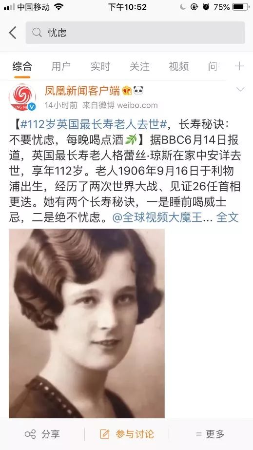 过度的忧虑,使人无法进前一步 6月14日,英国最长寿老人格蕾丝·琼斯去世,享年112岁。 她生于1906年,经历过两次世界大战、见证过26任英国首相。 这位经历了一个多世纪沧桑的老人乐观开朗,她透露了自己的两个长寿秘诀,一是睡前喝威士忌,二是绝不忧虑。