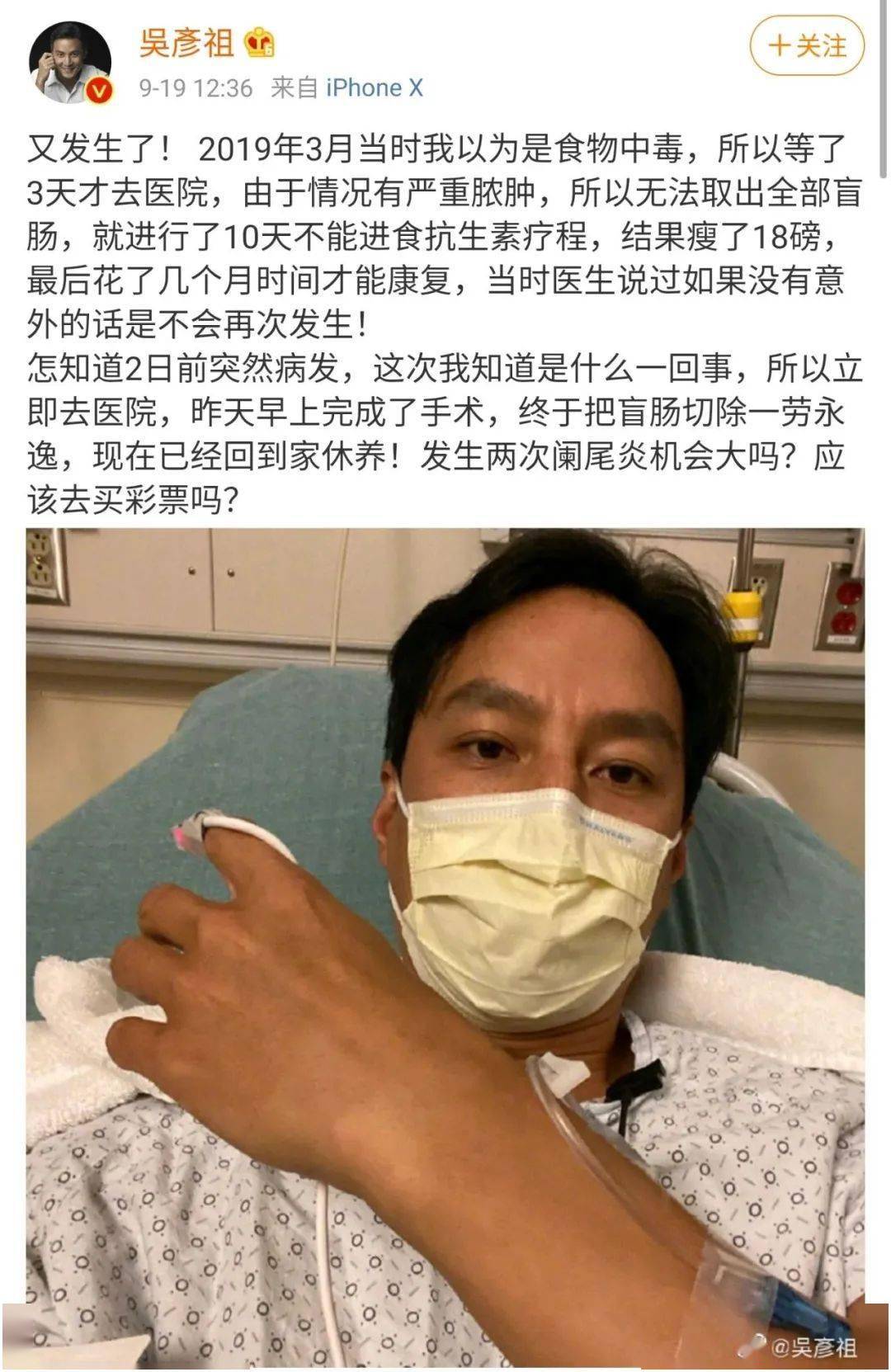 他在微博中调侃道:“发生两次阑尾炎机会大吗,应该去买彩票吗?” 虽然是一句玩笑话,但其实早在去年3月,他就因为阑尾炎住院,当时由于病情原因不能进食,体重掉了18 磅,差点伤及性命。