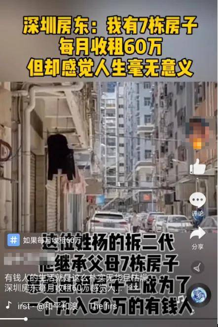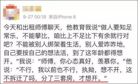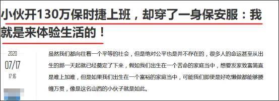 有的人,或许真的不是和我们生活在同一个世界里面的。 比如昨天刷上热搜的那个深圳拆二代。 他家里有7栋房子收租,是继承父母的房产,随着深圳的房价水涨船高,他靠这些房子,每个月可以收租60万。 但是他觉得人生没有意义,为了体验生活,寻找生命的真谛,他选择当一名出租车司机,让自己的生活充实起来。 现在,他感觉自己的生活很充实,每天都有事情做,虽然不缺钱,但是精神上有了依托。 这个小伙的故事在网上刷屏之后,网友们纷纷表示羡慕和酸哭了。 还有人说,那就把7栋楼要收租的房客编个码,今天收这个,明天收这个,那就不会无聊了。 其实,这就是我们生活中的“隐形富豪”,感觉人生没有什么意思,出来当一个出租车司机,只是为了体验生活,寻找生命的意义,充实一下自己而已。 这也并不是个例,随着经济的发展,有钱人越来越多,而像这样藏在我们身边的“隐形富豪”,也越来越多。 比如前段时间被媒体“曝光”的一个山西小伙。 据媒体@奋进车生活报道,山西有一个小伙在某小区当保安,每天兢兢业业上班,拿着2300每月的微薄工资。 然而人们发现,这个小伙很不一般,他抽的烟,是一般人根本消费不起的华子。 而更让人震惊的事情还在后面,这名小伙的座驾是一台保时捷帕拉梅拉,价格有130万元,如此豪车,他也只是拿来当代步工具。 面对质疑,小伙很坦诚地说:我就是来体验生活的。 原来,他是一个货真价实的富二代,父亲是当地某集团的董事长,而这名小伙之前浑浑噩噩,对赚钱提不起什么兴趣,于是就干起了保安,体验一下生活。 除此之外,还有在广州卖鸭肉饭的大叔。 在他的店子里面,鸭肉 +青菜+鸭汤,还加无限续饭,仅仅只要12元。 记者问他:“你为什么能卖那么便宜啊?挣得一定很少吧。” 老板笑着说:“挣得少,但是我生活得很开心。因为我有十栋房子收租。” 大叔还说,他买了宝马专门用来装菜送货,自己非常享受这种简单而又快乐的生活。 还有在上海当清洁工的阿姨。 在上海,有个创业公司的资金链断裂了,眼看就要关门的时候,公司里一个清洁工阿姨拿出600万给公司完成了融资,挽救公司于水火之中。 阿姨投资的理由也很简单,她说就喜欢公司的氛围,希望大家都不要走。 还有某烧饼摊大爷,他白天在灶前卖烧饼,晚上回到几百平的房子里面喝红酒。 我们的生活中藏着太多的“隐形富豪”,我们出来工作,是迫于无奈,生活所逼,而他们出来工作,只是生活太枯燥,出来寻找简单快乐的生活而已。 比如说前面那个深圳开出租车的小伙,他觉得当出租车司机很有意义,能够感受到快乐,其实这并不是出租车司机这个职位给他的,而是他有6栋房子出租,不用为生计发愁。 还有那个卖鸭肉饭的大叔,他能够保持鸭肉饭不涨价,买了宝马专门用来买菜,他感觉自己的生活简单又美好,这也不是这个工作本身带给他的,而是他有十栋房子收租,不要靠卖鸭肉饭赚钱。 人和人之间是不同的,有的人为了生计,不得不疲于奔命,甚至要打几份工,而有的人出来只是为了体验生活,享受简单又美好的生活,不求赚钱。 然而,后面这种人就总是喜欢劝前面的人想开一点,觉得赚钱不重要,要去享受生活,生命应该活得更有意义。 他们总是说,不要只知道赚钱,不要急着买房,应该去追寻更重要的东西,不要被物质和金钱束缚,要去追寻更有意义的东西,豁达、看开一点,不要被眼前俗气的东西蒙蔽。 比如身居高位,赚钱毫不费力的高晓松,他呼唤:生活不止是眼前的苟且,还有诗和远方。 比如排名富豪榜,曾经的地产大佬王石,他说:现在的年轻人都太急躁了,整天只想着赚钱,应该把精力更多地放到公益或者探险上去。 可是我想说的是,不是人人都有这个资本的。 温饱问题都没有解决,谈什么诗与远方? 说白了,那些把上班当体验的人,他们想任性就任性,想不去上班就不去上班,只是因为他们有任性的资本,而我们普通人如果跟随他们的脚步,马上就会遭遇生活的毒打。 还记得那个段子吗? 飞机上,一只鹦鹉对空姐说:“给爷来杯水”,猪也学鹦鹉,对空姐说:“给爷来杯水”,空姐大怒,将鹦鹉和猪都扔下了飞机。 这时鹦鹉对猪说:“傻B了吧,爷会飞”,而猪最后摔死了。 鹦鹉不过是因为自己有一双翅膀,所以在惹怒空姐之后还能成功逃生。 但我们如果真的学有钱人那样,觉得赚钱不重要,生命应该更有“意义”,一旦发生什么变故,你拿什么来应对? 没有资本还学着人家“佛系”,到时候苦逼的只有自己。 经济基础决定上层建筑,所有一切优雅、体面的背后,都是因为他可以卸下身上的经济压力,有机会、有资本去守护一个理想的东西。 有一个关于出租车司机的微博故事,我觉得很有意思。 大家看到没有?这个司机之所以能够想得开,能够活得豁达、通透的原因,并不是因为悟懂了什么人生大道理,而是他有了这个资本啊! 要是他每天都为了生计发愁,家里都等他赚钱来维持生活,他能够不被生活绑架,按照自己的想法去活吗? 很多人,总喜欢说那个渔夫的对话。 一个渔夫在海边晒太阳,有个人问他:“天气这么好,为什么不去捕鱼呢?” 渔夫说:“我捕鱼干什么呢?” “捕鱼你就能挣很多钱啊?” 渔夫又说:“挣钱又为了做什么呢?” 对方说:“挣钱你就可以买一艘更大的船” 渔夫接着问:“买大船又做什么呢” 对方回答说:“这样你就可以打更多的鱼,挣更多的钱,然后安心在海边晒太阳。” 最后,渔夫