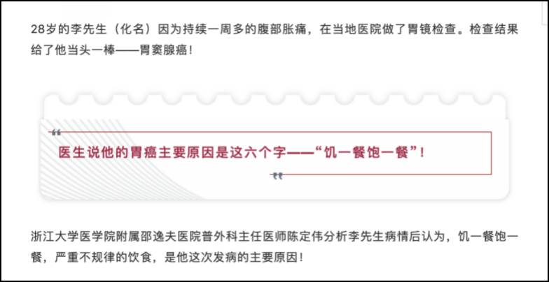 2018年浙医在线报道,28岁李先生被诊断患有胃窦腺癌,在询问病史及生活、饮食习惯,排除遗传性肿瘤家族病史后医生认为,饥一餐饱一餐,严重不规律的饮食,是他这次发病的主要原因。