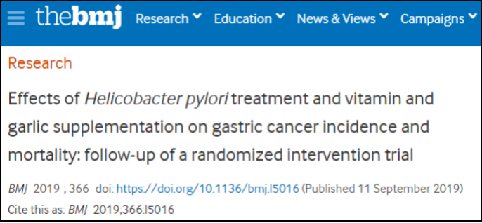因此,研究人员尝试使用大蒜补充剂等来帮助预防胃癌。2019年9月权威医学期刊《英国医学杂志》在线发表的由北大肿瘤医院的李文庆和游伟程等在山东临朐进行的一项持续跟踪22年的研究显示,幽门螺杆菌根治、维生素补充剂、大蒜补充剂三种方法,都可以有效降低胃癌死亡风险。