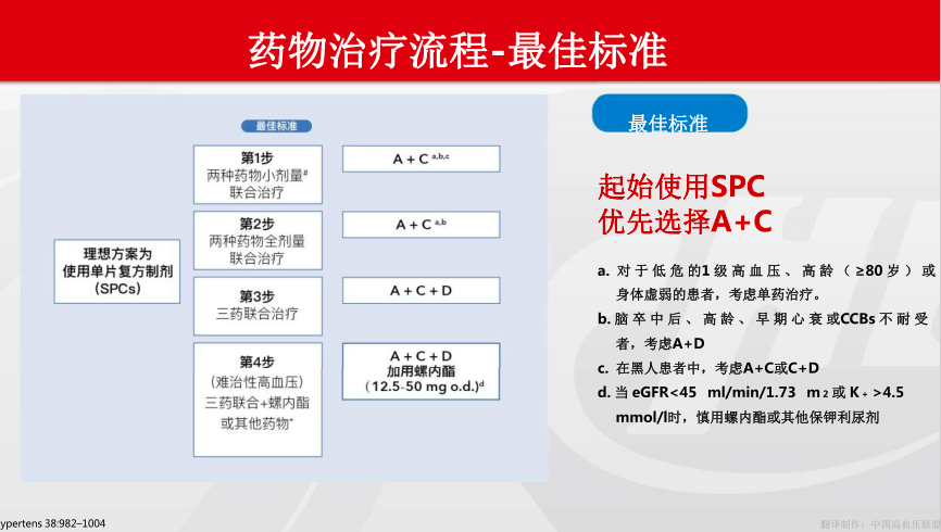 四、高血压药物治疗更加标准化 ISH指南中除了对非药物治疗作出指导,同时也推出了高血压药物治疗的标准化方案。 指南强调,对于高血压患者而言,基本标准所有高危高血压患者,立即开始药物治疗,这与我国指南一致;对于低危和中危患者,如果3—6个月生活方式干预血压仍不得控制,则开始药物治疗。 最佳选择治疗则应选择单片复方制剂(single-pill combination,SPCs),其中第一步是小剂量SPC或联合治疗,以A[血管紧张素转化酶抑制剂(ACEI)或血管紧张素Ⅱ受体拮抗剂(ARB)]+C[钙拮抗剂(CCB)]为主导。
