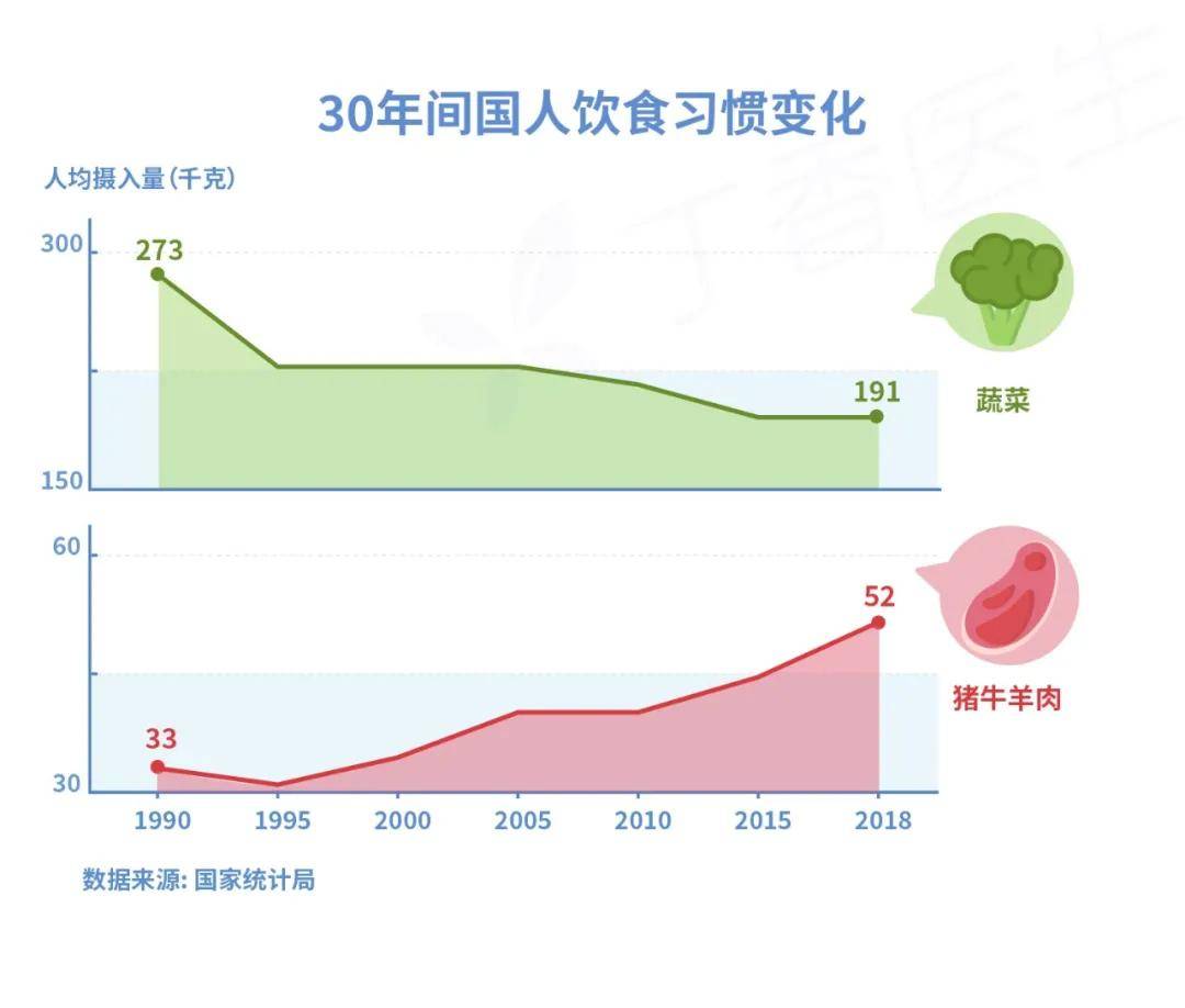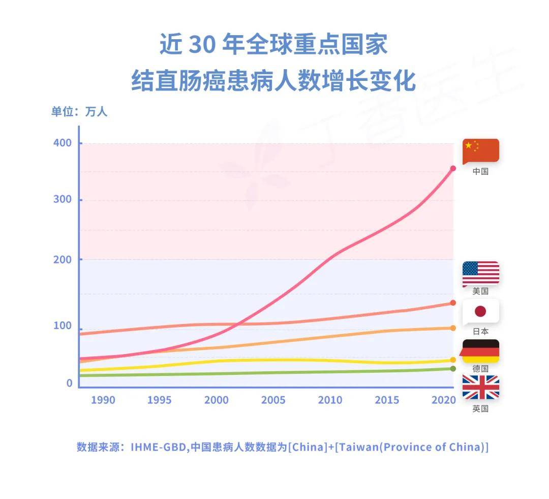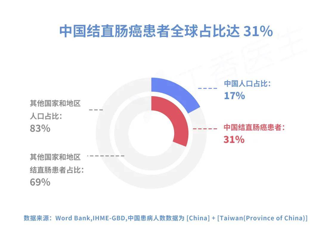 在所有消化系统的肿瘤中,结直肠癌可以说是最能「防」和 最好「治」 的肿瘤。 但是,中国结直肠癌患者在全球的占比,居然高达 31% 。 或许有人会说「中国人多呀,那患者数量自然也会多一些」。 有道理,但不全对。 中国确实人多,但总人口大约只占全球总人数的 17%,而结直肠癌患者在全球的占比却达到了 31%。 很明显,以全球 17% 的人口占据着全球 31% 的患者,这个数据是异常的。 为什么这么多结直肠癌患者 都在中国? 往前倒推 30 年,全球结直肠癌患病人数最高的国家,并不是中国,而是美国(划重点,后面要考),中国的患者数量排名大约在第 2 或者第 3 的位置。 然而短短的 30 年间,中国的结直肠癌患者人数飞速增加,现存患者已经是美国的 2.6 倍了。 如果只保留 1990 年患病人数排名前 5 的国家,可以更明显地看出,30 年间,其他高发国的患者数量平稳增长,而中国,「一飞冲天」。 在结直肠癌激增的背后,过去 30 年,发生了什么? 我们要做什么,才能避免自己被结直肠癌选中? 一、唯一的好消息: 中国人的寿命变长了 结直肠癌作为癌症一员,拥有癌症的共同特征——老龄化,40~50 岁以后显著上升。 在中国,大部分结直肠癌患者都是 70~79 岁的老人。 随着医疗条件、公卫政策更各方面的发展,我们活的更久了。 早在 30 年前,中国人的平均寿命还不到 69 岁,或许有很多潜在患者,在查出或者患上结直肠癌前,就已经过世了。 30 年后,中国的平均寿命上升到了 77 岁,越来越多的结直肠癌患者在高龄被确诊。 二、饮食习惯变化: 我们吃了更多的致癌物 肠胃健康,和吃了什么有密切的关系。 日常摄入更多的膳食纤维,有助于减少结直肠癌的患病几率,蔬菜粗粮是它的主要来源。 (悄悄说一句,膳食纤维会影响每天排出粑粑的量哦) 而高脂饮食、 过多动物蛋白特别是过多红肉, 是结直肠癌致病的主要危险因素。其中,加工肉类作为 1 类致癌物,更有可能跟增加结直肠癌发病有关系。 (加工肉类包括:如香肠、培根、火腿、牛肉干、腌牛肉,以及其他烟熏、盐渍、发酵或腌制的肉类) 不幸的是,在增加膳食纤维摄入和不要吃过多红肉这两方面,我们都做得不太好。 30 年前,餐桌上的常客是蔬菜和主食,荤菜都是逢年过节才能吃上的稀罕玩意儿。现在,我们桌上的、外卖里的各种肉类越来越多,蔬菜却少得可怜。 此外,酒精作为另一种 1 类致癌物,消费量变化也不容忽视。 逢年过节、走亲访友、请客吃饭时喝点小酒总是不可避免,对比近几年的数据,中国饮酒率有明显上升趋势。 相关研究表明,与从来不喝酒的人对比,饮酒者患结直肠癌的风险显著增加。 除了饮食上的变化外,肥胖率增高、运动量减少等变化,也为结直肠癌的增加做出了一点贡献。 但无论是寿命延长还是饮食变化,都是全球共同发生的,例如世界的平均寿命从 1990 年的 65 岁提升至 2018 年的 73 岁,美国肥胖率常年居高不下,人均肉类消费量也不低…… 凭什么只有中国的结直肠癌患者「鹤立鸡群」? 三、早筛意识薄弱: 「拖延」出的结直肠癌 结直肠癌并不是突然出现在身体里的,它往往要经过十余年的发展,才会变成癌症。 在中国,很多人不知道,当结直肠癌还只是一个肠道内的小息肉时,就可以用肠镜检查出来了。 调研数据显示,97% 的结直肠癌患者患病前未做过肠镜筛查,其中 87% 的患者未做肠镜筛查的原因是不知道需要定期做肠镜筛查。 当我们还在四处询问「什么年龄需要做肠镜筛查?」「肠镜检查怎么做?」「我需不需要做?」的时候,美国、日本很早就发现了结直肠癌病程发展漫长这一特点,并且有针对性地做了一项非常关键的举措——全民普筛。 距今,美国的结直肠癌「国家筛查计划」已经执行了将近 20 年,日本甚至在 1992 年,就已经推出了全民筛查政策。 在全民筛查普及度较高的国家,许多患者查出结直肠癌时大多都在癌症早期,甚至是尚未癌变阶段,发病率和死亡率大大降低。 但还有很多国家,老百姓缺乏早筛意识,许多患者往往等到身体已经出现不适才去医院检查,错过最佳治疗时期,导致「一发现就是晚期」的悲剧。 超过 45 岁,要去做肠镜检查 癌症千变万化,但预防方式却有相似之处。 虽然「少吃咸肉少喝酒,多吃蔬果多运动」听起来很老生常谈,但它却是每个人每一天都能做出的选择和改变。 而癌症筛查,则是医学进步给我们每个人改变结局的机会。 在结直肠癌预防这件事上,美国和日本过去 30 年的成果给我们提供了非常好的参考。如果我们能保持健康的生活方式,同时提高早筛意识,把尚未癌变的息肉扼杀在摇篮中,使已经癌变的患者尽早接受治疗,中国结直肠癌患者数量降低指日可待。 结直肠癌给了我们 10 年左右的时间去发现它,请千万不要辜负了它的「好意」。 结直肠癌预防小贴士 一般建议超过 45 岁的人,都应该进行肠镜检查。如果是高危人群,则应该尽早去做,例如: - 家里有人得结直肠癌;